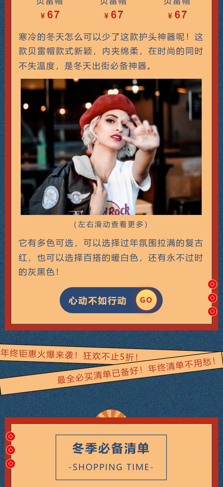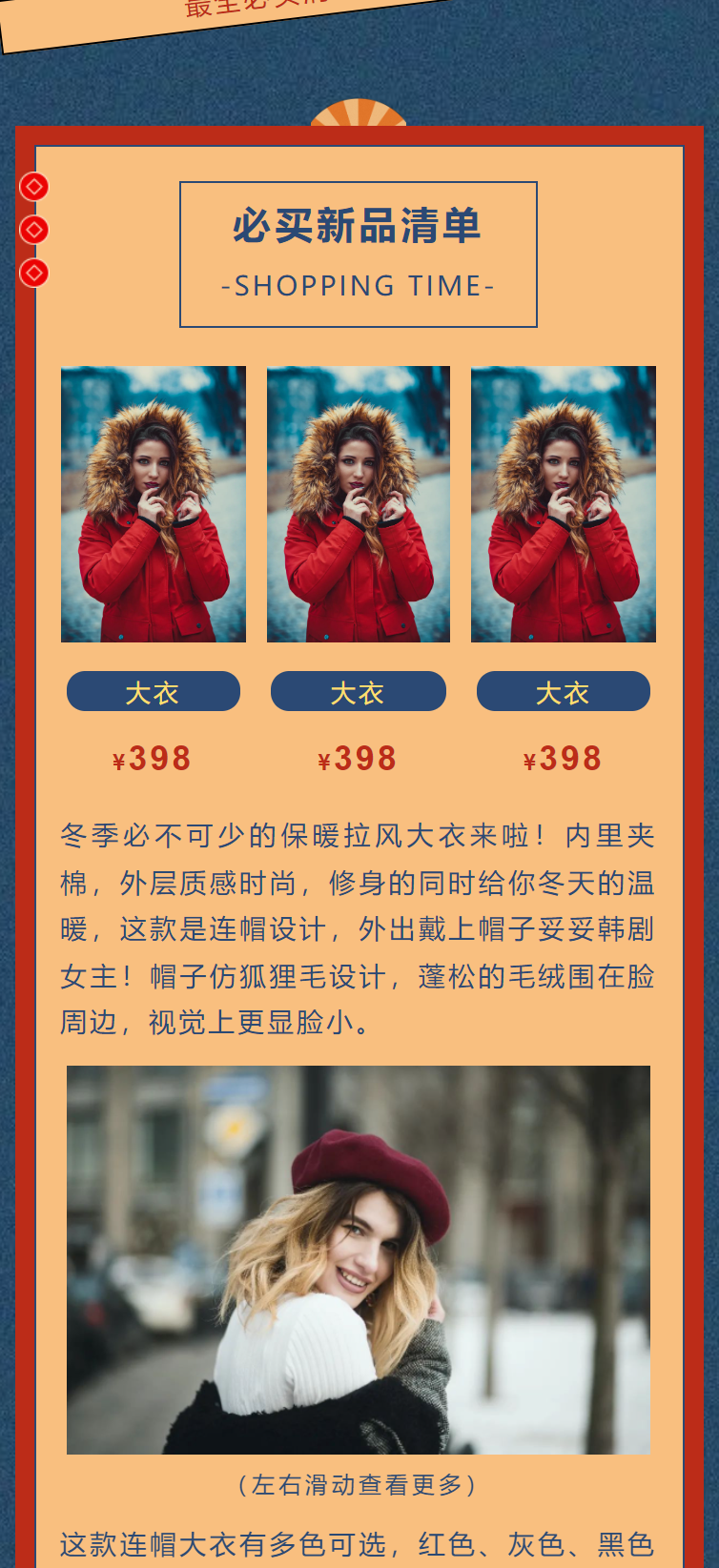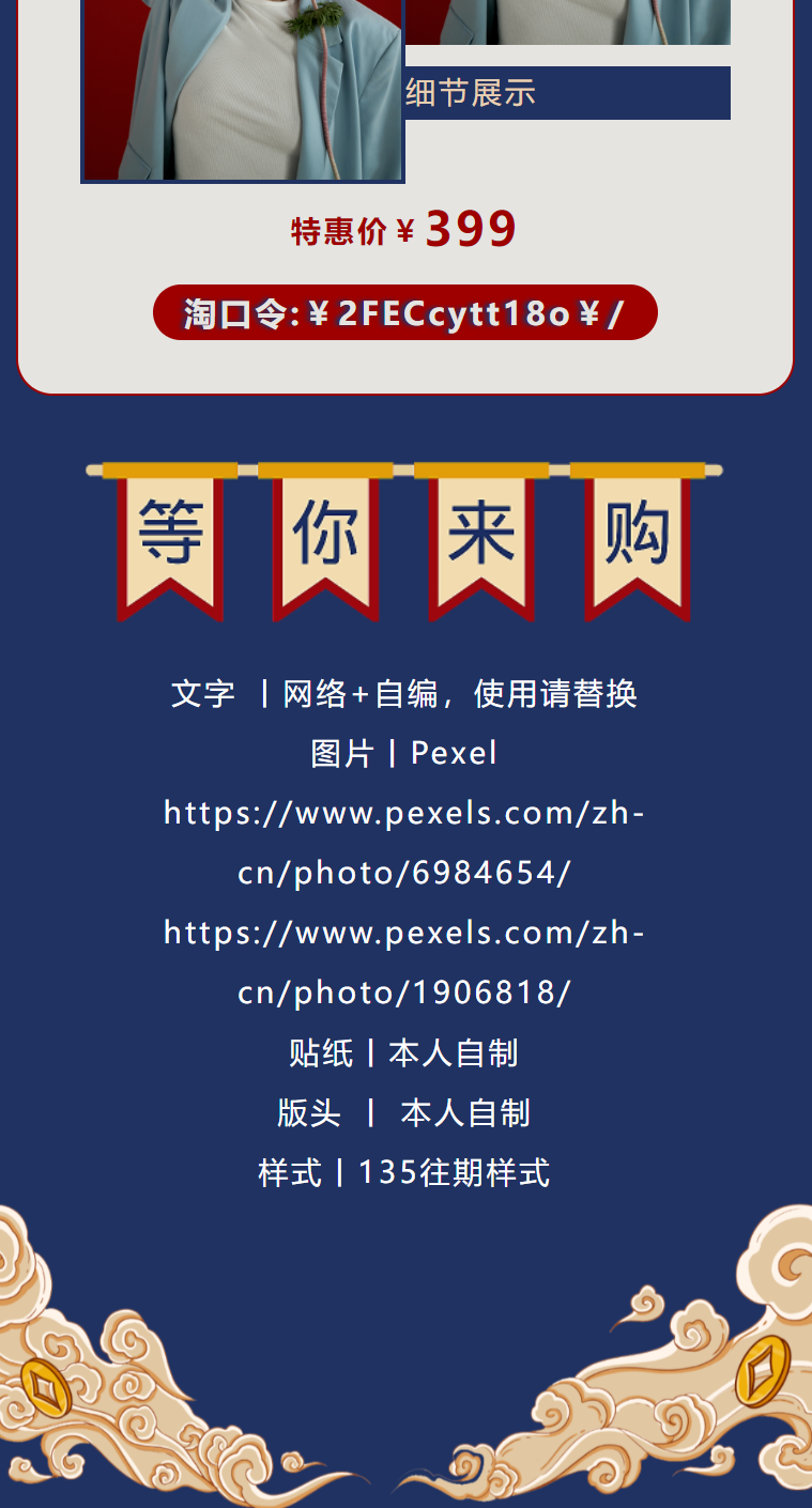 模板使用建議:這類風格的模板在顏色上會選擇對比度較高的,如深藍和深紅色,元素上會使用一些懷舊元素,傳遞出很濃的復(fù)古味兒~推薦服飾、化妝品以及一些擁有國貨品牌的行業(yè)使用。