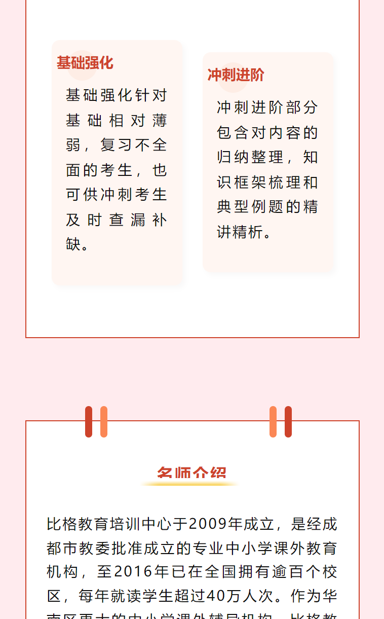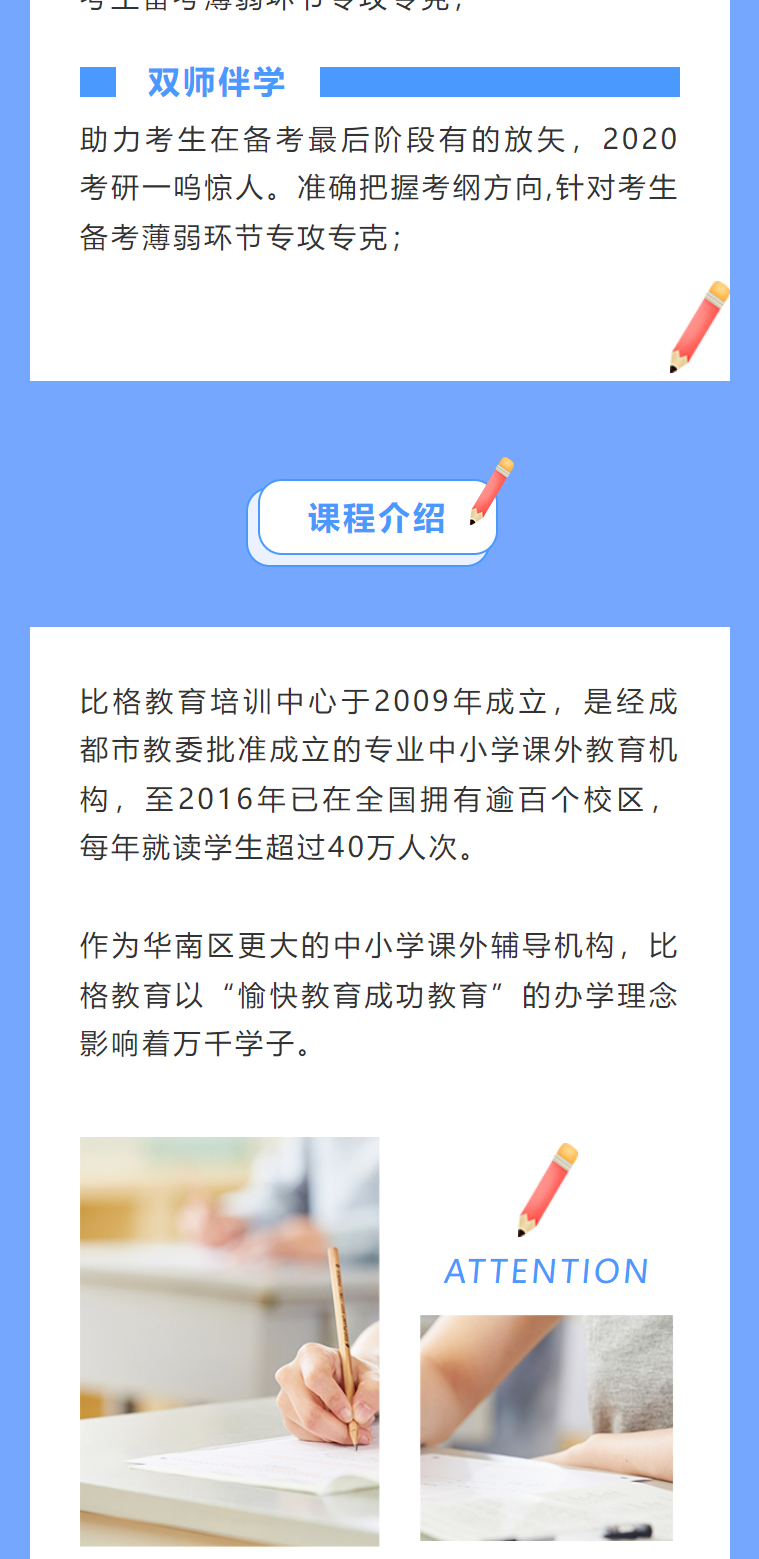 適用場(chǎng)景:適用于各類(lèi)培訓(xùn)班的課程內(nèi)容詳細(xì)介紹、名師介紹,不限于考研機(jī)構(gòu),像興趣班(舞蹈、美術(shù))都可以采用,里面還可以適當(dāng)增加課程價(jià)格等信息。