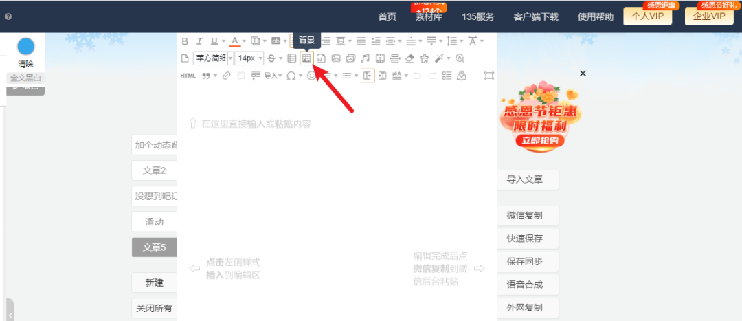 在135編輯器頁面上方的工具欄中找到【背景】選項,打開背景設(shè)置;