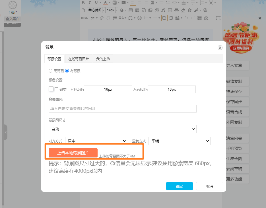 若是純色背景和系統(tǒng)提供的背景都不喜歡怎么辦呢?你還可以在【背景設(shè)置】中上傳一張你喜歡的圖片作為文章背景。