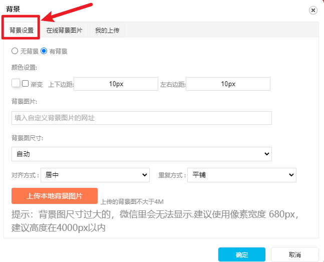 自行上傳的背景圖一定要去設(shè)置背景圖尺寸、對齊、重復(fù)顯示的方式(這個沒有固定選項需要大家手動測試調(diào)整)