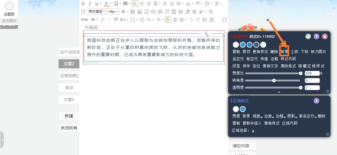 選中需要添加背景的樣式,在彈出的全局(或區(qū)域)樣式設(shè)置中,點擊【背景】