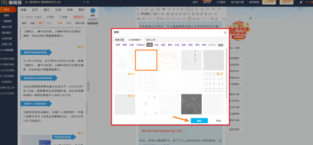 設(shè)置好文章背景色后,我們再次打開編輯器上方工具欄的【背景】,在【在線背景圖片】中,135編輯器為大家準(zhǔn)備了好看的靜態(tài)、動態(tài)背景圖,供大家挑選。