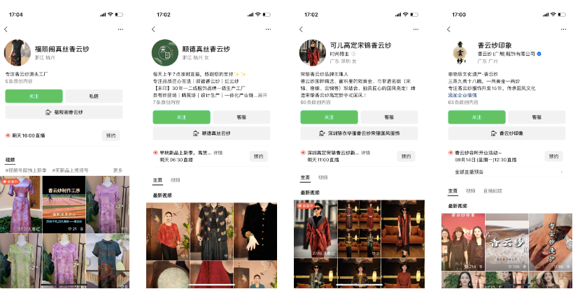 另外,或許屏幕前細(xì)心的你也發(fā)現(xiàn)了,從上述進(jìn)入到我們拆解范圍的直播間來看,大部分都沒有以品牌的形式出現(xiàn),而更多的是工廠直出貨源,或者是所謂的香云紗傳承人等更偏向于達(dá)人直播間的帶貨模式存在。而一些在市場上比較知名的香云紗品牌, 比如唐賢香云紗,還只是將視頻號作為一個宣發(fā)陣地而不是帶貨渠道。對比抖音生態(tài)來看,香云紗品類雖然競爭已經(jīng)白熱化了,但是也鮮少有品牌出圈,單品的勝利能否進(jìn)化成品牌的優(yōu)勢,或許是香云紗這個產(chǎn)品商業(yè)化的下一步需要思考的問題。
