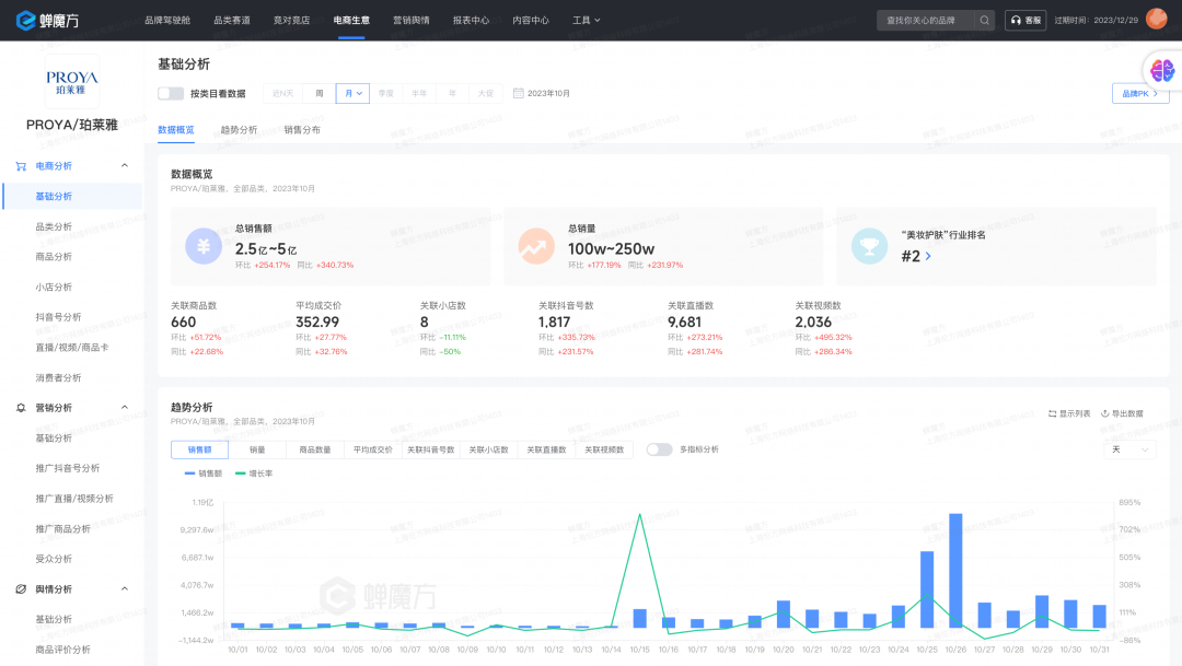 該篇珀萊雅研究中用到了數(shù)據(jù)洞察工具「蟬魔方」,它能夠圍繞抖音平臺的諸多展示維度,幫助品牌了解自己、競品和消費者,從而快速感知市場變化,有效制定數(shù)字化經(jīng)營策略。