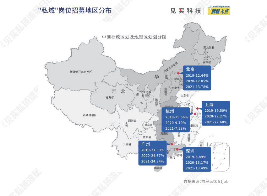 據(jù)調(diào)查,最關(guān)注私域的5大城市依次是廣州、上海、北京、深圳、杭州。這也意味著相應(yīng)的私域人才也集中在這些城市。