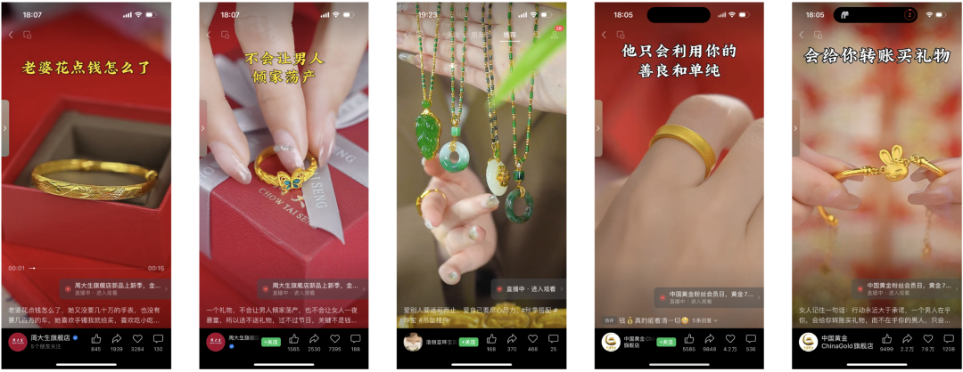 在黃金珠寶品類中,爆款短視頻的內(nèi)核可以定義為引起情感共鳴。以其中的一條文案為例:「一個(gè)禮物不會讓男人傾家蕩產(chǎn),也不會讓女人一夜暴富,所以送不送禮物、過不過節(jié)日、關(guān)鍵不是錢的問題、而是情的問題,你說呢?」