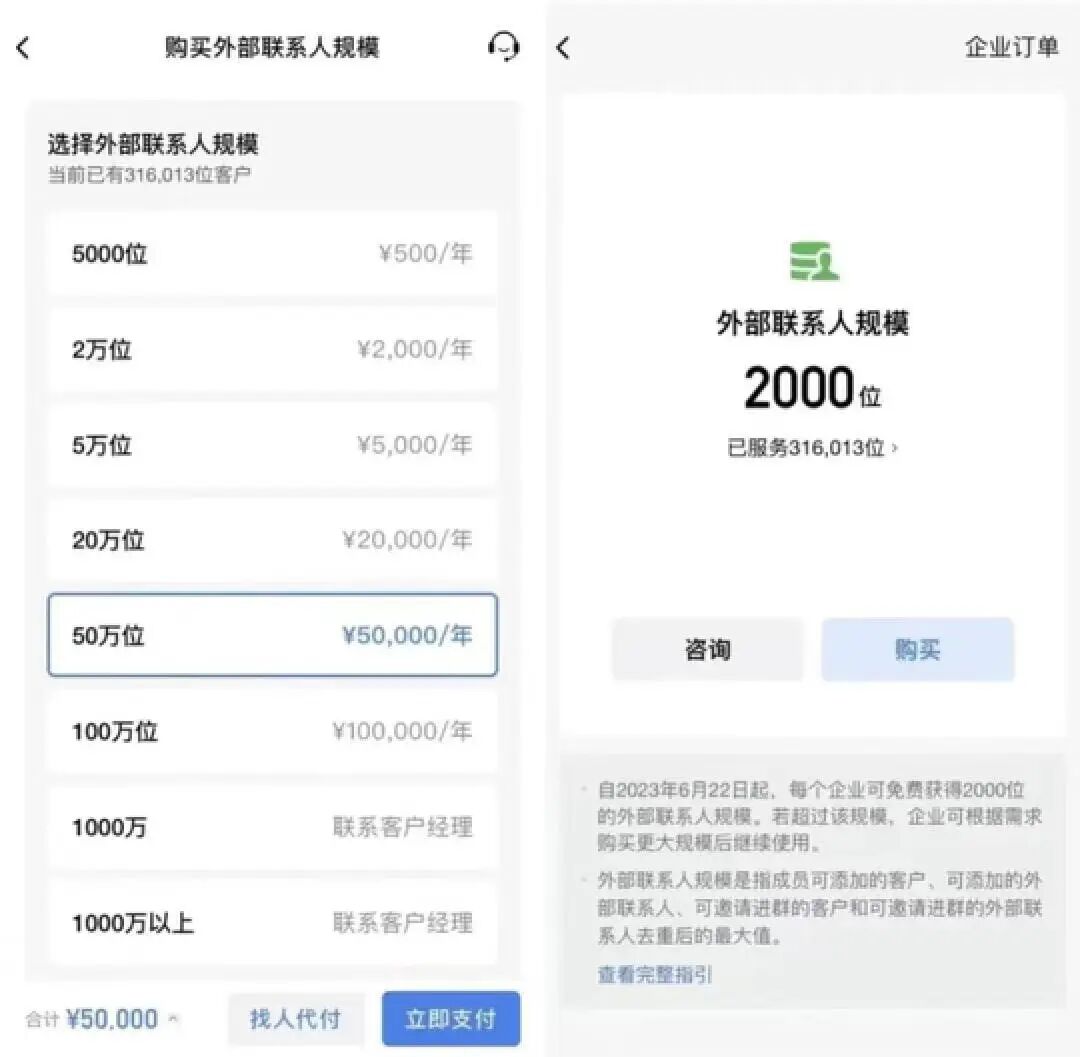 通知顯示,自 5 月 7 日起,部分企業(yè)要想繼續(xù)添加客戶、邀請(qǐng)客戶入群,需要額外購(gòu)買外部聯(lián)系人規(guī)模。收費(fèi)標(biāo)準(zhǔn)為 1 個(gè)客戶 0.1 元一年,每個(gè)企業(yè)有 2000 個(gè)名額的免費(fèi)額度,超過(guò)了才收費(fèi)。