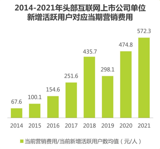 艾瑞咨詢發(fā)布的《2022 年移動(dòng)應(yīng)用運(yùn)營(yíng)增長(zhǎng)洞察白皮書》顯示,2021 年國(guó)內(nèi)頭部互聯(lián)網(wǎng)公司的人均獲客成本達(dá)到 572 元,是 7 年前的 8.5 倍。羊毛出在羊身上,這些成本最后幾乎都需要品牌來(lái)承擔(dān),也就直接導(dǎo)致品牌在公域獲客成本成幾何式增長(zhǎng)。
