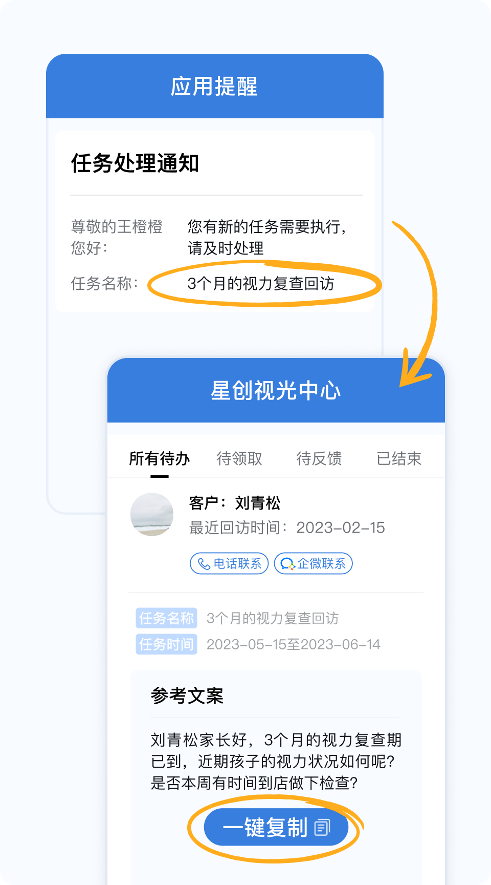 從用戶進(jìn)店開(kāi)始,提供完整全面的眼視力健康篩查與評(píng)估,形成個(gè)人視光數(shù)據(jù)電子檔案,結(jié)合檢查結(jié)果給到用戶適合的產(chǎn)品建議。還要和家長(zhǎng)共同約定后續(xù)全套復(fù)查計(jì)劃,并通過(guò)私域,在企業(yè)微信里定期提醒家長(zhǎng)復(fù)查,日常生活中也要常常和家長(zhǎng)溝通護(hù)眼知識(shí)。