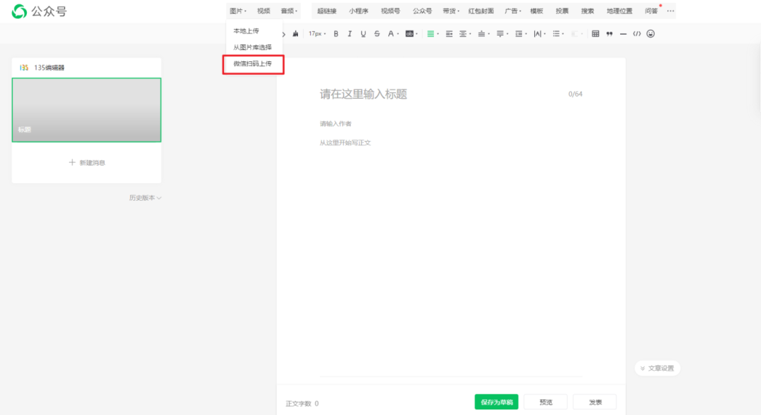 在微信公眾號后臺上傳圖片現(xiàn)在新增了【微信掃碼上傳】