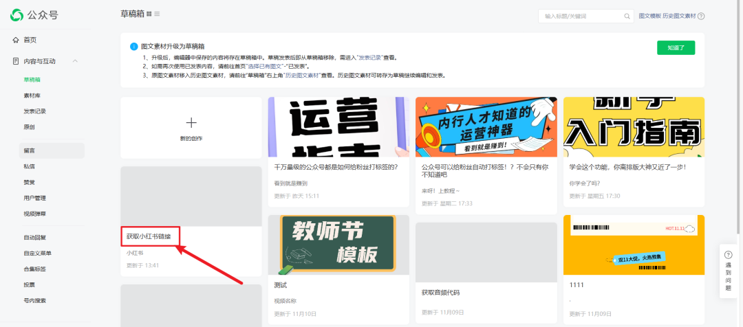 然后在微信后臺的[草稿箱]中,找到剛剛保存的小程序草稿文章點擊標題,進入預覽鏈接。