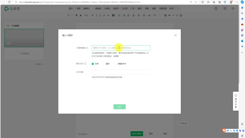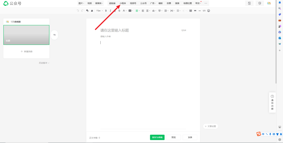 在微信公眾號后臺新建一篇文章,添加小程序。