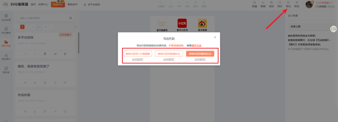 同樣最后我們選擇導出,選擇復制到135編輯器或是微信公眾號后臺。