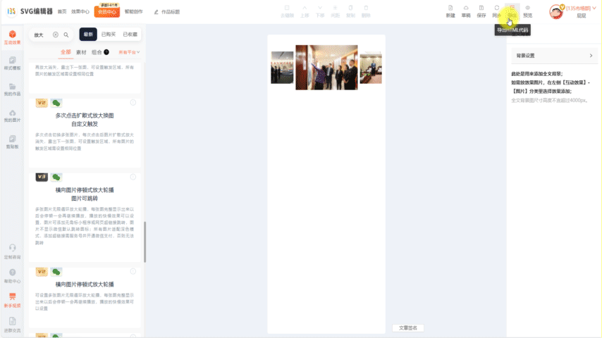 在SVG編輯器中完成效果制作后,選擇右上角的[導(dǎo)出-[復(fù)制代碼到135編輯器]