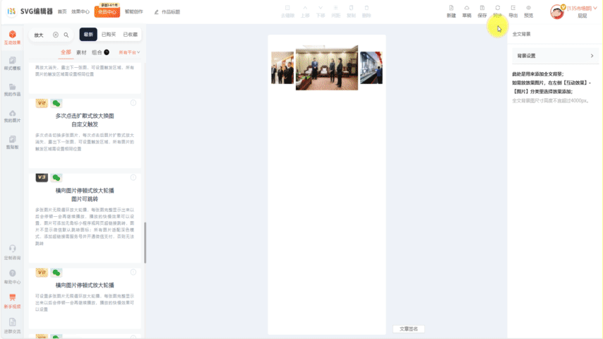 3.圖片展示單一:大多數(shù)企業(yè)習(xí)慣一段文字一張圖或一段文字多張圖的方式排版。若是像活動(dòng)成果展示主體推文,照片數(shù)量較多,我們可以使用輪播SVG進(jìn)行展示,這樣可以有效縮短文章篇幅,也能增加文章的律動(dòng)。