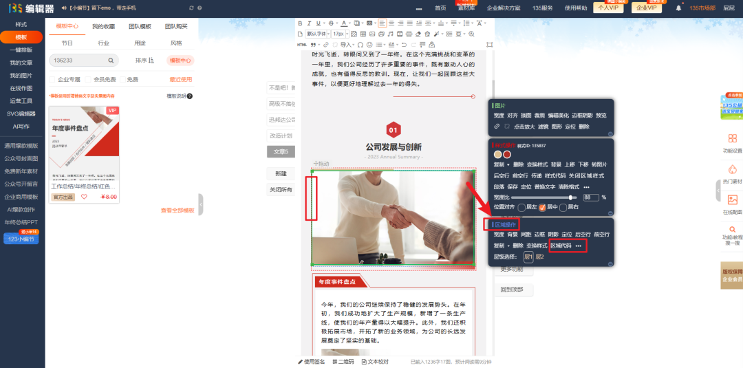 添加SVG到模板:根據(jù)需要,將SVG效果添加到原模板的圖片位置或空行處。如果是圖片位置,點(diǎn)擊圖片,在“區(qū)域操作”中找到“區(qū)域代碼”,粘貼SVG代碼;如果是空行處,點(diǎn)擊空行,在“區(qū)域操作”中選擇“區(qū)域代碼”,粘貼SVG代碼。