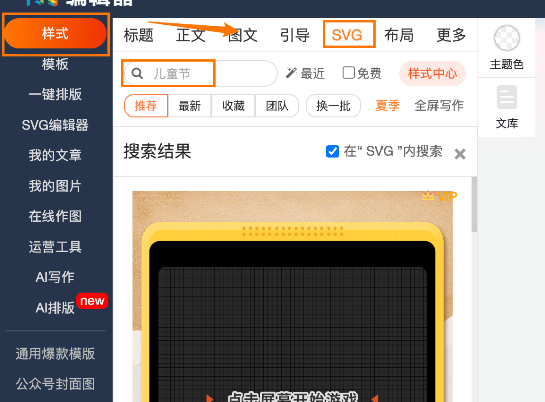 在編輯器頁面左側(cè)選擇【樣式】——【SVG】版塊中搜索關(guān)鍵詞“兒童節(jié)”即可出現(xiàn)。