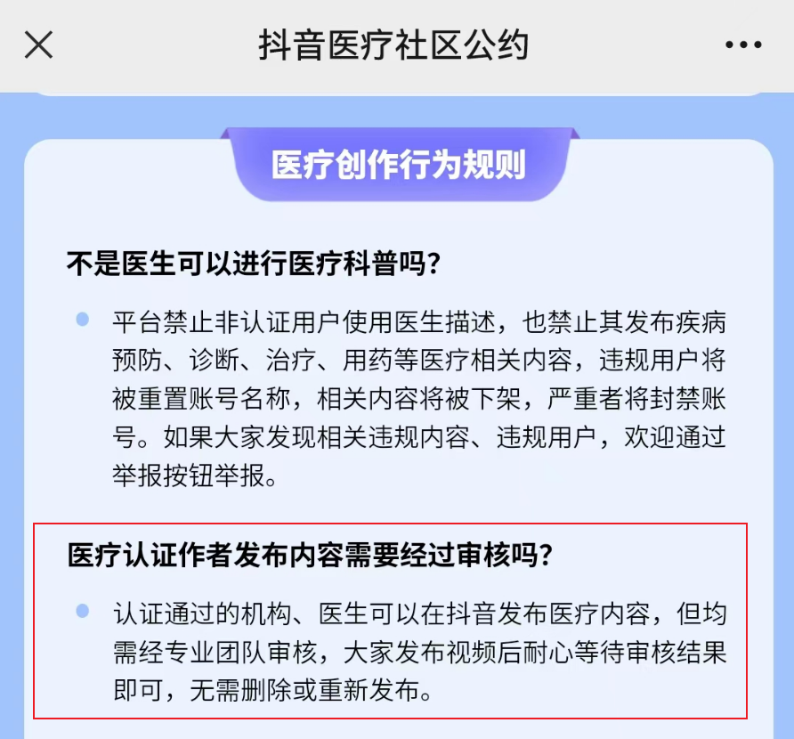 客觀性、科學(xué)性是醫(yī)療科普內(nèi)容的最核心指標(biāo)。那么在創(chuàng)作者發(fā)布作品前,各個(gè)平臺(tái)是否有能力進(jìn)一步保證內(nèi)容的客觀性和科學(xué)性呢?首先,運(yùn)營(yíng)社還是從各個(gè)平臺(tái)公開的官方規(guī)則入手,看看是否有內(nèi)容審核方面的規(guī)則公告。但查了一圈,我們只在抖音的《抖音社區(qū)醫(yī)療公約》(參考文件詳見底部 [6])找到明確文字:均需經(jīng)過(guò)有專業(yè)團(tuán)隊(duì)審核。不僅如此,在《深圳特區(qū)報(bào)》的一篇報(bào)道中,抖音健康相關(guān)負(fù)責(zé)人曾表示:該團(tuán)隊(duì)的成員均由有中西醫(yī)學(xué)背景的人員構(gòu)成。(注:報(bào)道鏈接詳見參考文件 [15])隨后,我們又向業(yè)內(nèi)的朋友咨詢了其他平臺(tái)的情況。據(jù)業(yè)內(nèi)人士反饋,快手也是有專業(yè)團(tuán)隊(duì)審核醫(yī)療相關(guān)內(nèi)容的,但其人員是否要求具有專業(yè)醫(yī)學(xué)背景尚不得知。至于 B站、小紅書、微博,我們目前暫未查詢到可靠的公開資料佐證。(注:如有遺漏或錯(cuò)誤,歡迎知道內(nèi)情的讀者朋友留言反饋。)