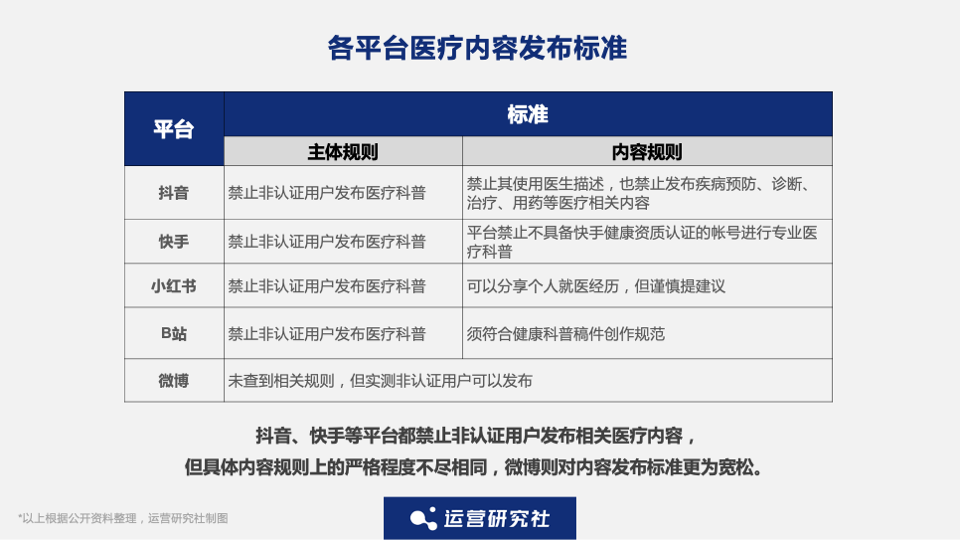 綜上所屬,我們可以對(duì)本次測(cè)評(píng)做一個(gè)總結(jié)。本次測(cè)評(píng)從三個(gè)維度出發(fā):創(chuàng)作者的篩選、內(nèi)容審核、商業(yè)化約束,對(duì)抖音、快手、小紅書、B站、微博五個(gè)平臺(tái)進(jìn)行對(duì)比。盡管有一些平臺(tái)的規(guī)則并未查到,但綜合來(lái)看,抖音在這三個(gè)維度的規(guī)則是更完善,且相對(duì)更嚴(yán)格的。小紅書和快手分別在創(chuàng)作者篩選和內(nèi)容審核維度上,僅次于抖音;而 B站和微博的管理規(guī)范更接近于興趣認(rèn)證管理,整體管控相對(duì)寬松。最后運(yùn)營(yíng)社想說(shuō)的是,健康是人類永恒的追求,但醫(yī)療行業(yè)最大的特點(diǎn)就是信息不對(duì)稱性,普通公眾很難快速獲取到全面、準(zhǔn)確的醫(yī)學(xué)信息,這也是健康領(lǐng)域成為謠言“重災(zāi)區(qū)”的重要原因。醫(yī)療科普扮演者著提升全民健康素養(yǎng)、樹立正確健康觀的角色。而這不是醫(yī)生或平臺(tái)單方面可以實(shí)現(xiàn)的,還需要從醫(yī)院、到平臺(tái),再到政策支持、輿論引導(dǎo)等多方面著手,建立合理的激勵(lì)制度、治理制度,才能真正凈化健康科普知識(shí)傳播環(huán)境,鏟除謠言生存的土壤。我們也希望能通過(guò)本次測(cè)評(píng),客觀、真實(shí)地為大家展示下各個(gè)平臺(tái)在醫(yī)療科普方面的表現(xiàn)和治理水位,為醫(yī)療科普行業(yè)盡一份綿薄之力。