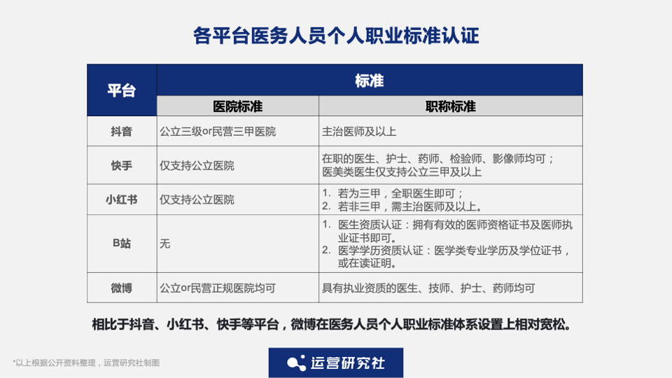 從表格對(duì)比里我們可以發(fā)現(xiàn),抖音、小紅書、快手的標(biāo)準(zhǔn)都非常嚴(yán)格,但各自對(duì)細(xì)節(jié)的要求有差別:抖音的認(rèn)證標(biāo)準(zhǔn)極為嚴(yán)格的,不僅對(duì)醫(yī)院等級(jí)有高門檻,個(gè)人認(rèn)證醫(yī)師必須來(lái)自「公立三級(jí)」或「民營(yíng)三甲」的醫(yī)院,而且醫(yī)生必須滿足主治醫(yī)師及以上職稱;小紅書則僅接受公立醫(yī)院醫(yī)師,但對(duì)醫(yī)院的評(píng)級(jí)沒(méi)做特別說(shuō)明,但若醫(yī)院為公立三甲以下,則需要醫(yī)生的職稱滿足主治醫(yī)師及以上;快手和小紅書情況類似,也只支持公立醫(yī)院,但可認(rèn)證的醫(yī)護(hù)工作者類型會(huì)更多元,不僅醫(yī)生可以認(rèn)證,在職的護(hù)士、藥師、檢驗(yàn)師、放射科/醫(yī)學(xué)影像師也可認(rèn)證;特別的是,快手針對(duì)于醫(yī)美類的醫(yī)生做了特殊要求,必須在公立三甲以上醫(yī)院工作;而微博和 B站更傾向于興趣認(rèn)證,所以僅需要提供能證明專業(yè)背景的各類認(rèn)證資質(zhì)即可,所以嚴(yán)格程度相對(duì)較弱。2)各平臺(tái)哪些賬號(hào)可以發(fā)布醫(yī)療內(nèi)容?
