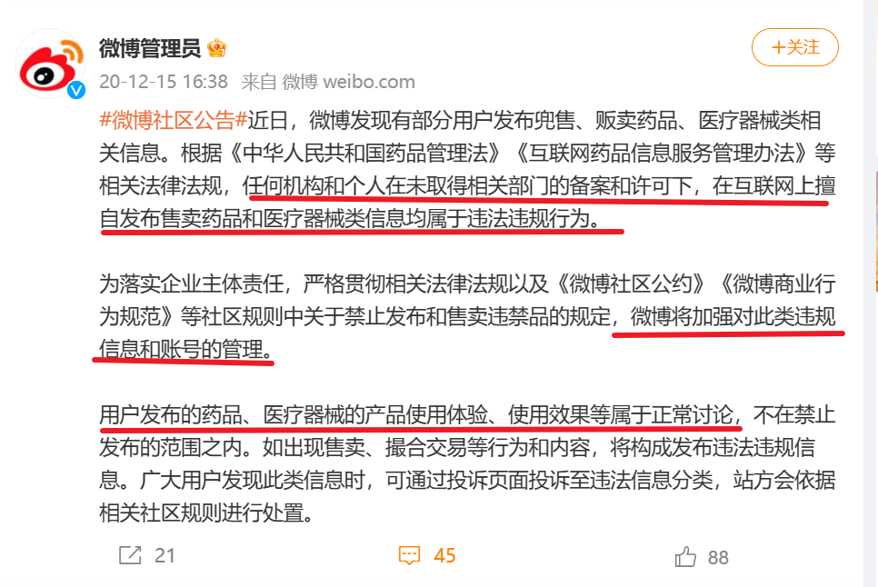從圖表里我們可以看到,抖音的限制是最為徹底的,不僅禁止帶貨,更是直接關(guān)閉了私信和粉絲群互動(dòng)功能,并且禁止認(rèn)證醫(yī)生賬號(hào)綁定 MCN。快手的公告文件里,雖沒(méi)找到明確的禁止帶貨醫(yī)療、健康類商品,但在內(nèi)容上明確限制了對(duì)醫(yī)療效果的描述。小紅書同樣禁止引流或提供聯(lián)系方式,但在帶貨和推廣的態(tài)度是:可進(jìn)行,但需要在平臺(tái)相關(guān)規(guī)定內(nèi)。然后是 B站,非常遺憾我們并沒(méi)有找到公開文件,所以無(wú)法多做評(píng)論。微博則禁止帶貨,但根據(jù)規(guī)定,似乎推廣討論產(chǎn)品效果,以及引流內(nèi)容仍不被禁止。