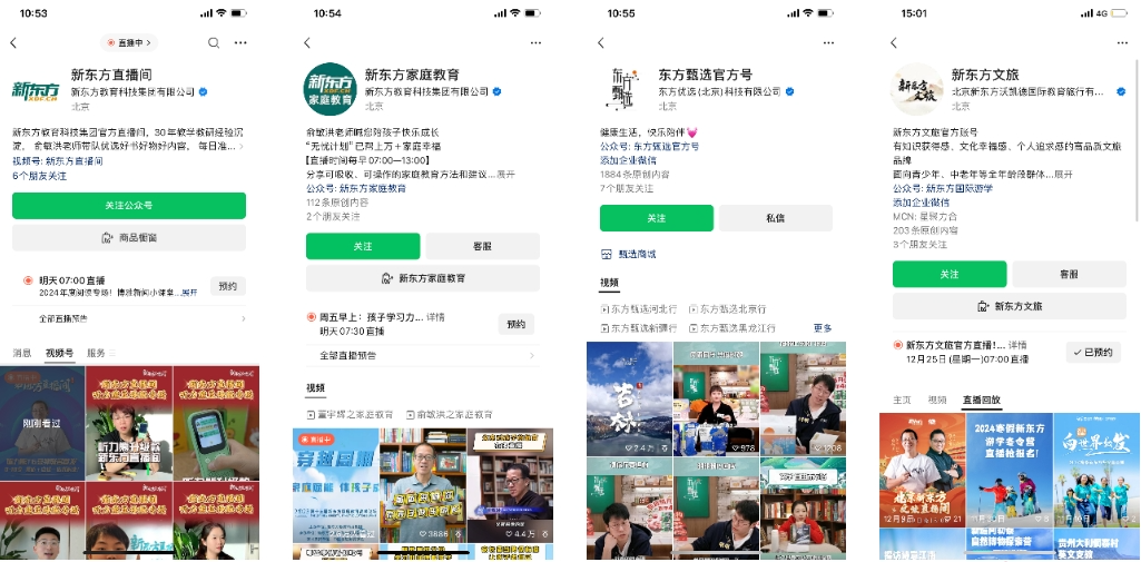 教培類的直播間,新東方自然是首先要關(guān)注的。跟在抖音一樣,目前,新東方在視頻號(hào)的布局分為三條線:一條是以【新東方直播間】、【新東方家庭教育】為代表的教育和課程相關(guān)的直播,一條是以【東方甄選官方號(hào)】為主的農(nóng)產(chǎn)品帶貨賬號(hào);還有一條是以【新東方文旅】為代表的文旅產(chǎn)品線。