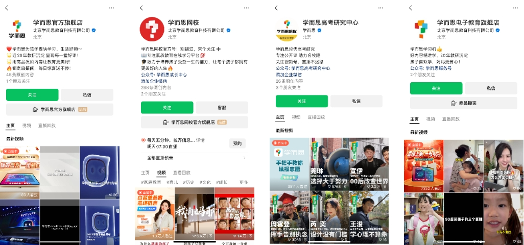 另一個(gè)在榜單上的教培機(jī)構(gòu)學(xué)而思在視頻號(hào)中也形成了矩陣化的布局,除了賬號(hào)【學(xué)而思官方旗艦店】之外,還有包括【學(xué)而思電子教育旗艦店】、【學(xué)而思高考研究中心】、【學(xué)而思科學(xué)競(jìng)賽】、【學(xué)而思網(wǎng)?!俊ⅰ緦W(xué)而思】、【學(xué)而思文史院】等在內(nèi)的藍(lán)V認(rèn)證賬號(hào)。