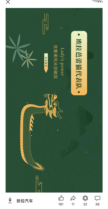 這篇端午節(jié)主題推文來自歐拉汽車,他們將端午節(jié)的傳統(tǒng)項目劃龍舟與產(chǎn)品推廣結合在一起,共設置了四艘龍舟來展示,每艘龍舟都代表了歐拉汽車不同的汽車類型,當用戶點擊特定位置,龍舟會緩緩展開,呈現(xiàn)出該類目下的汽車圖片,這樣的展示形式構思巧妙,既與端午節(jié)聯(lián)系起來,又達到了良好的宣傳效果。