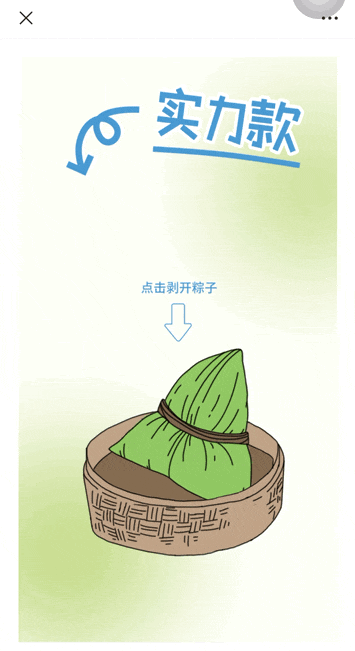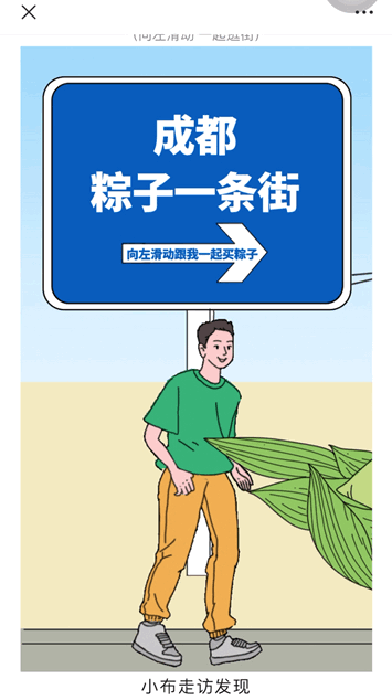 這篇成都發(fā)布的推文,圍繞端午節(jié)粽子展開了創(chuàng)作,他們設計了兩個部分進行呈現(xiàn),第一部分是買粽子,通過運用三層左滑的交互效果,制作逛街買粽子的場景,讓用戶跟隨該圖中人物滑動,開啟一場沉浸式云逛“粽子一條街”模式。第二部分是剝粽子,在這部分介紹了多款不同類型的粽子,比如:實力款、歷史款,讓用戶了解成都特色,看到了成都的多樣性。這兩個部分銜接自然,有趣的交互效果+精心設計,讓用戶感受到滿滿的端午氛圍。
