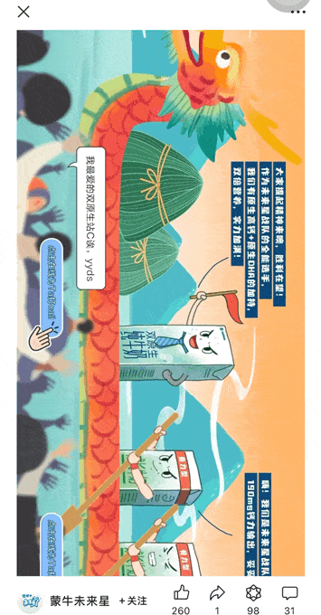 蒙牛未來星的這篇端午節(jié)推文同樣用了劃龍舟的創(chuàng)意,他們在設置龍舟上的不同角色:舵手、鼓手、劃手時,都用了自己Q版的熱門產(chǎn)品進行了代替,當用戶點擊特定位置為他們打call時就會切換成動態(tài)比賽狀態(tài),帶大家感受了一場線上劃龍舟比賽的情景,通過這種動靜對比的形式,讓推文看起來生動又有趣。