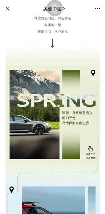 這是一篇來自奧迪品牌的汽車產(chǎn)品介紹推文,他的角度不是圍繞產(chǎn)品的功能展開,而是以一年四季作為切入點,以出發(fā)為主題,展示了消費者在每個季節(jié)如果想要來一場說走就走的旅行,奧迪都會陪伴在左右,就像是“朋友”一樣,給你隨時出發(fā)的勇氣,角度新穎。在排版設(shè)計上,使用到了高質(zhì)量清晰的汽車風(fēng)景圖片與點擊彈出SVG效果的結(jié)合,構(gòu)思巧妙。