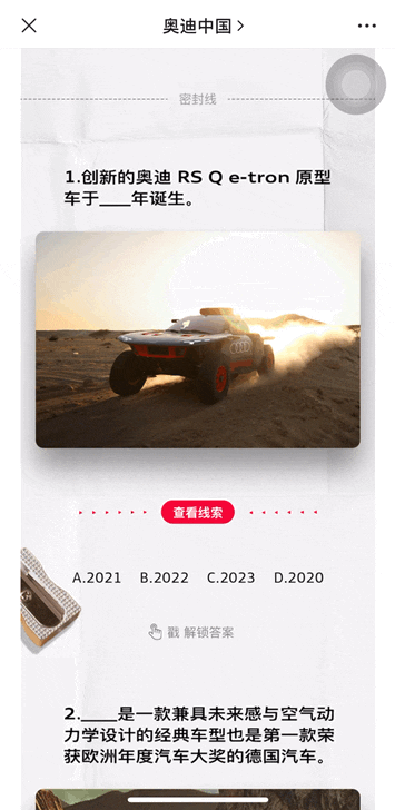 這篇推文內(nèi)容圍繞奧迪品牌的一些關(guān)鍵節(jié)點做成了試題來展示,讓用戶進行沉浸式答題,與用戶之間形成了極強的互動。在排版設(shè)計上,雖然運用了基礎(chǔ)的點擊換圖效果,但多組點擊換圖效果放在一起,組成題目,再加上逼真的考卷設(shè)計,讓整篇內(nèi)容也變得創(chuàng)意滿滿。