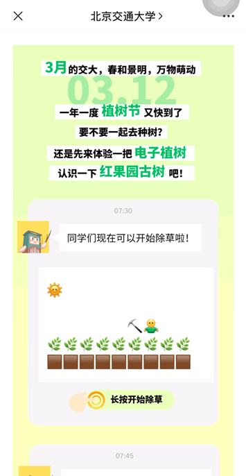 這是北京交通大學(xué)以植樹(shù)節(jié)為主題推出的內(nèi)容,他們將電子種樹(shù)的想法運(yùn)用到了推文之中,利用多組圖片模擬種樹(shù)的過(guò)程,并搭配了長(zhǎng)按換圖的SVG交互效果,讓讀者實(shí)現(xiàn)沉浸式線上種樹(shù)的體驗(yàn),趣味十足。
