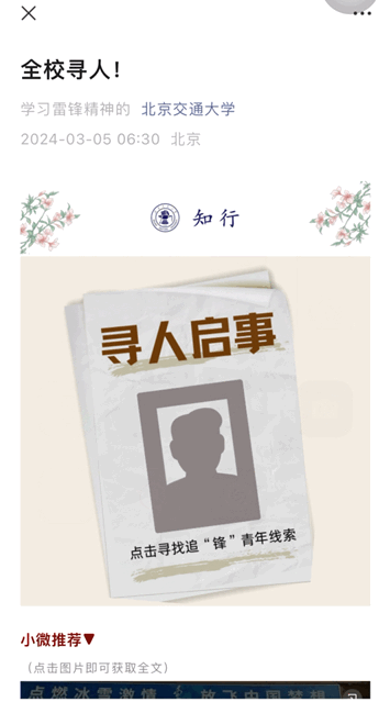 比如下面這篇是學(xué)雷鋒紀(jì)念日主題的推文,他們以“尋人啟事”的想法為創(chuàng)意角度切入,再搭配上點(diǎn)擊彈動(dòng)展開(kāi)的SVG效果,吸引讀者進(jìn)行互動(dòng)解鎖,并瀏覽全文,這種創(chuàng)意思路增加了推文的易讀性。