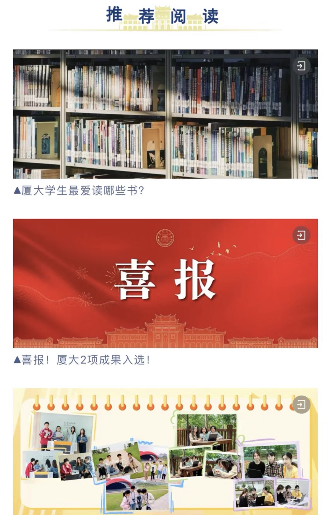 多數(shù)高校的推文會(huì)在尾部設(shè)置往期回顧列表,他們會(huì)將近期發(fā)布過(guò)的文章以圖文列表的形式再次展示,這樣既可以增加往期推文再度曝光的機(jī)會(huì),也讓讀者不再錯(cuò)過(guò)近期精彩內(nèi)容。