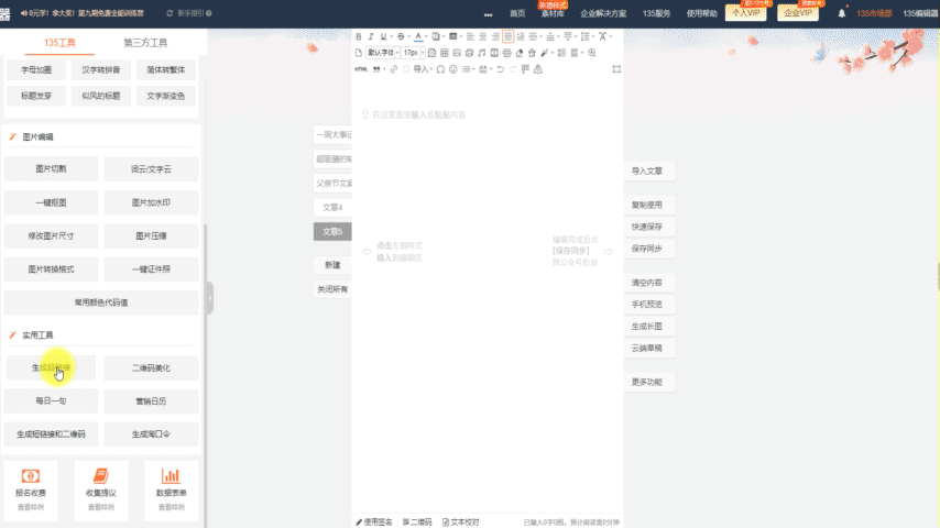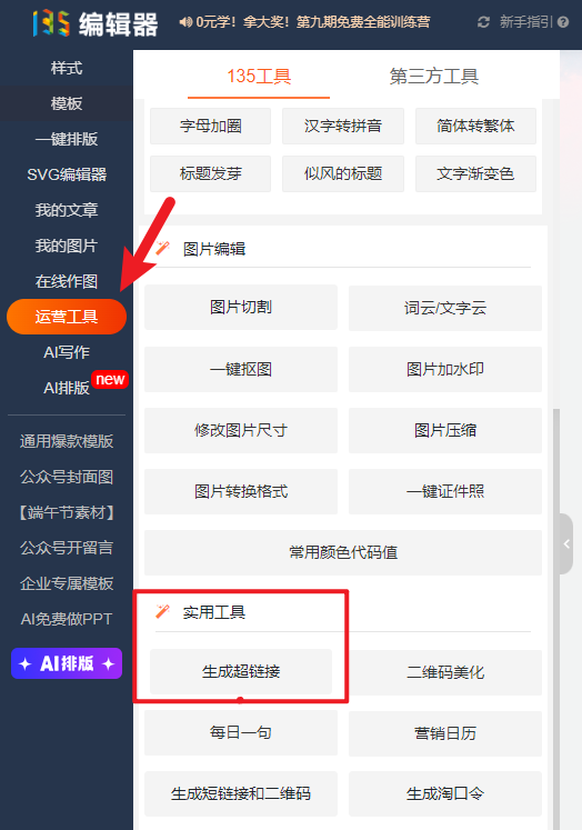 在編輯器左側(cè)找到「運(yùn)營工具」選擇「實(shí)用工具」中的「生成超鏈接」