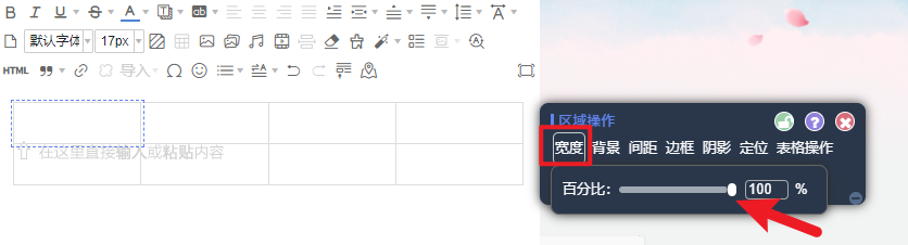 選中表格后,在「區(qū)域操作」中選擇「寬度」拖動進(jìn)度條調(diào)整表格寬度。