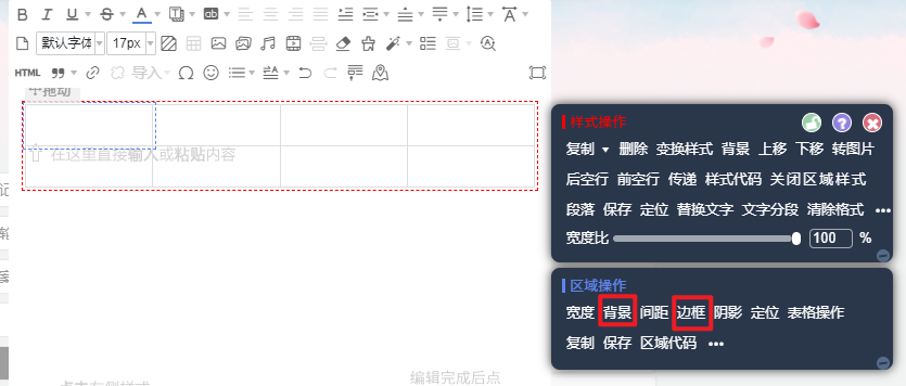 選中表格后,在「區(qū)域操作」面板中,選擇背景/邊框可分別修改表格的背景色和邊框色