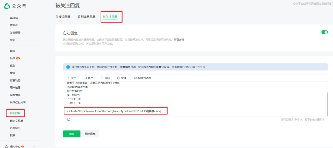 復(fù)制好生成的鏈接,我們跳轉(zhuǎn)到微信公眾號后臺,在自動回復(fù)中粘貼剛剛的鏈接。