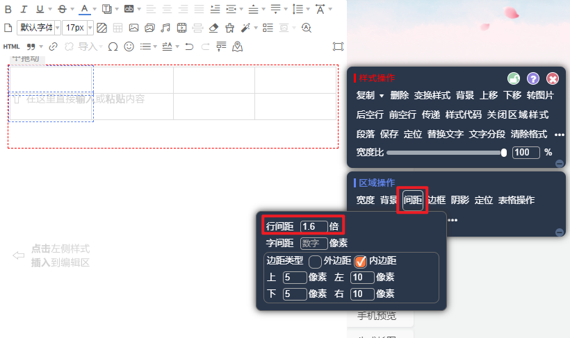 選中表格后,在「區(qū)域操作」中選擇「間距」然后選擇「行間距」調(diào)整數(shù)值即可。