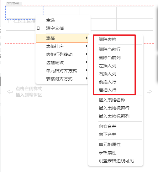 插入表格后,如果我們想要增刪行列,需要選中表格后鼠標(biāo)「右鍵」,選擇「表格」下拉二級菜單中有對表格的詳盡格式調(diào)整,如增刪行列、合并等內(nèi)容。