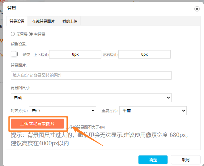 點擊【上傳本地背景圖片】,在文件夾中選擇上傳自己制作好的背景圖,可以對上傳好后的背景圖進行調(diào)整,包括【背景圖尺寸】、【對齊方式】、【重復(fù)方式】。