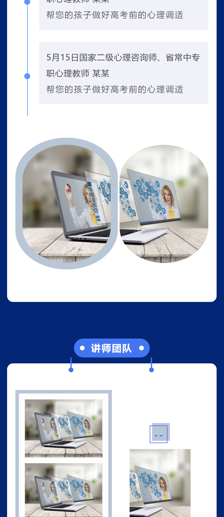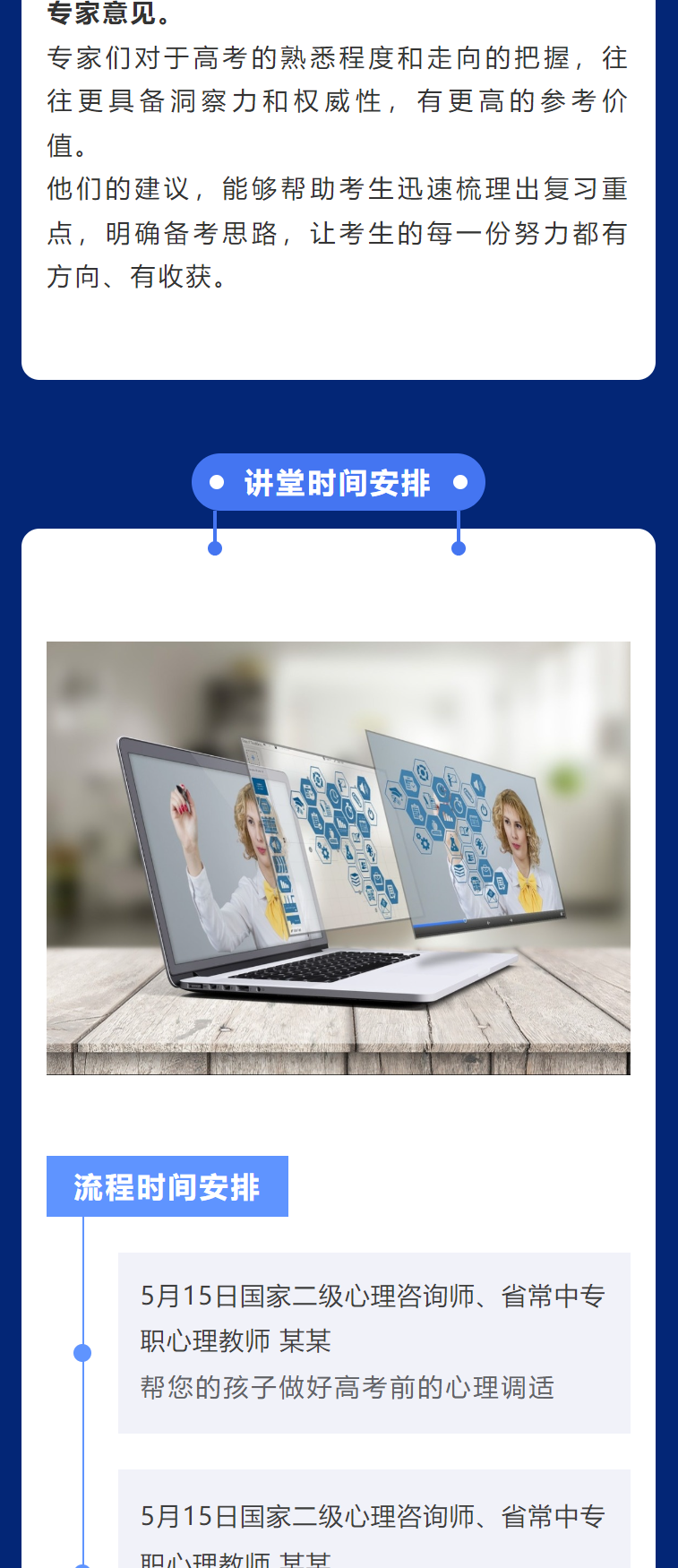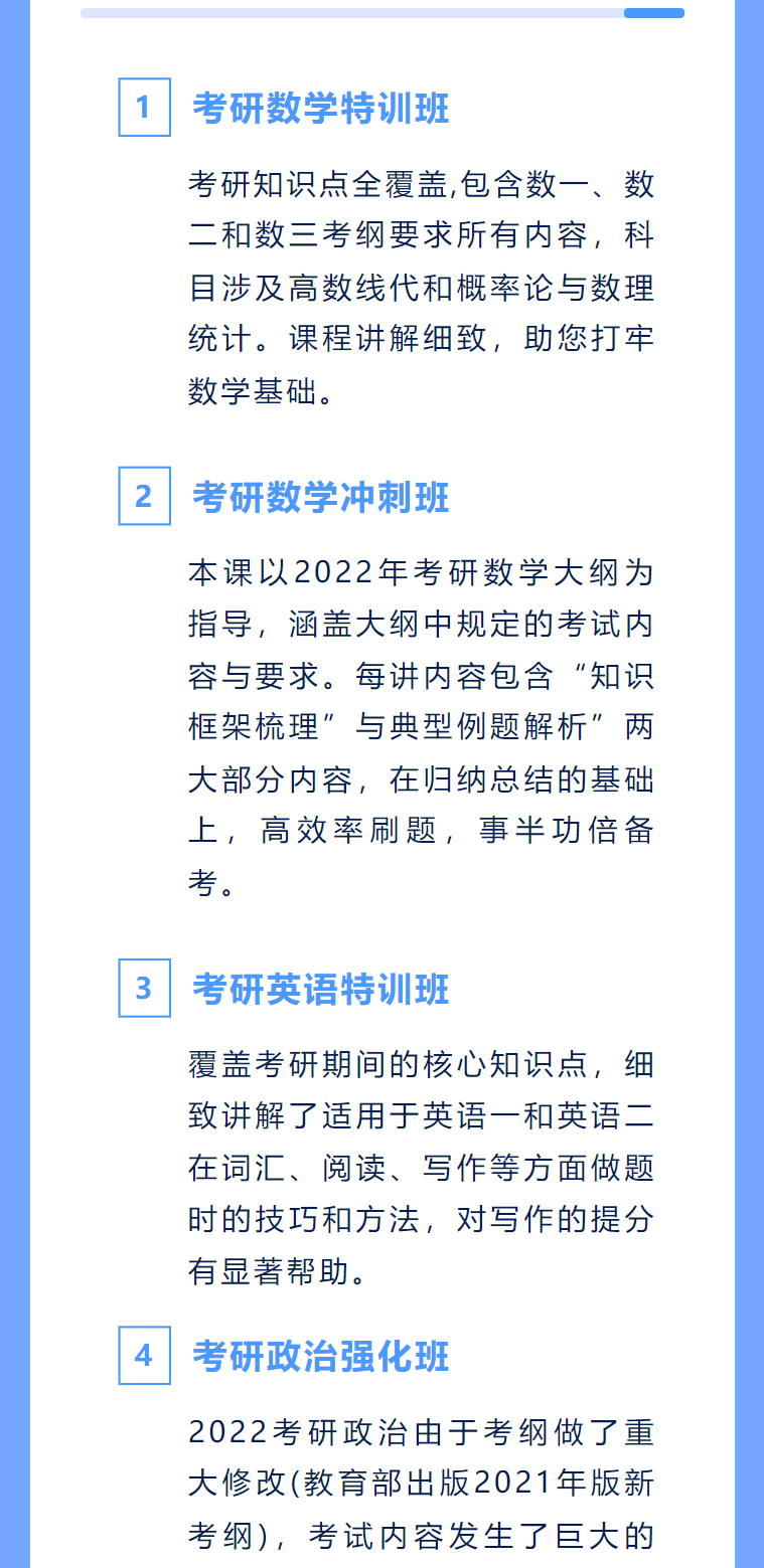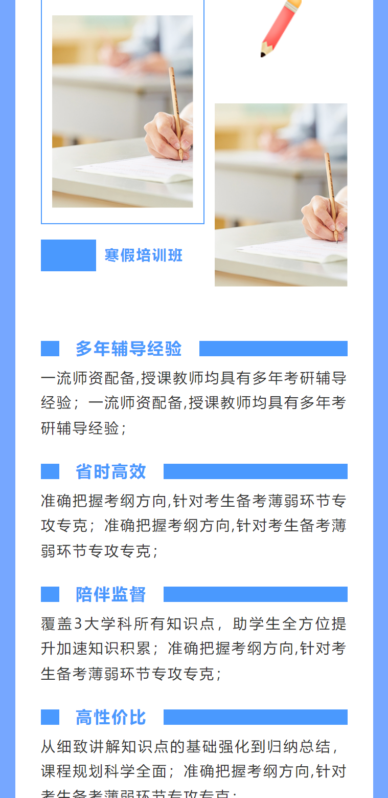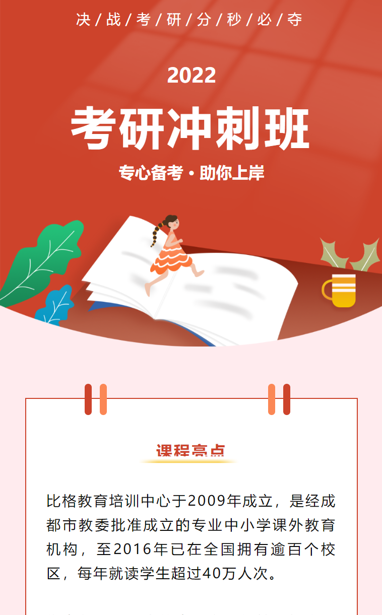適用場景:適用于各類培訓(xùn)班的課程內(nèi)容詳細介紹、名師介紹,不僅限于考研機構(gòu),像興趣班(舞蹈、美術(shù))都可以采用,里面還可以適當增加課程價格等信息。
