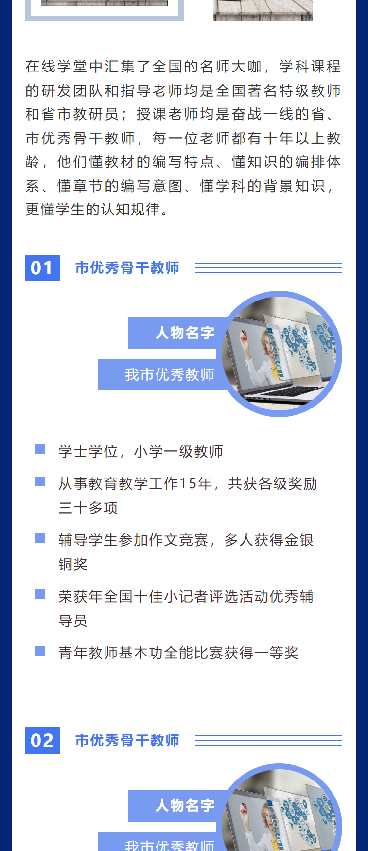 適用場景:適用于介紹培訓(xùn)機構(gòu)的師資力量、名師培訓(xùn)活動記錄。