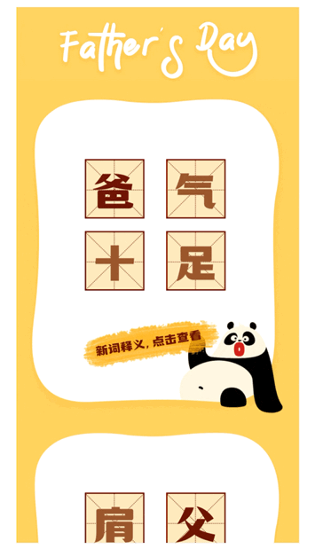 比如這篇父親節(jié)主題的推文,他們利用5組跟“父”相關(guān)的諧音成語(yǔ),通過(guò)引導(dǎo)用戶點(diǎn)擊查看釋義的方式,從多角度向大家展示了父親對(duì)子女的愛(ài),在此基礎(chǔ)上再引出品牌活動(dòng),銜接自然。