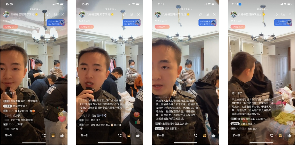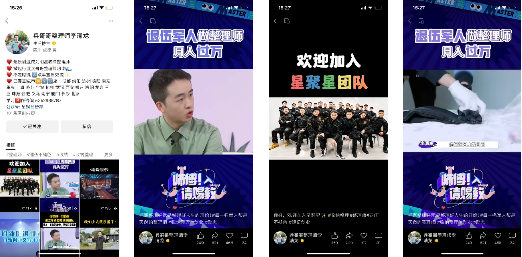 整理收納師這個(gè)職業(yè),雖然目前還是女性主導(dǎo),但是也有很多男性以“闖入者”的身份,打破了行業(yè)的刻板印象,比如下面我們要介紹的這兩個(gè)直播間,給男性主播出圈提供了兩種不同的路徑。【整理收納師久弟】的主播因?yàn)橄矚g干凈整潔的家,愛(ài)上了收納整理,于是開(kāi)始在視頻號(hào)中直播分享自己的收納過(guò)程,雖然沒(méi)有女性的溫柔,但久弟的直播間在講解上,常常會(huì)給人一種理性的條理感,他會(huì)細(xì)致地對(duì)比收納盒與衣服的寬度,同時(shí)也會(huì)兩件衣服放在一起對(duì)比,從而保證折疊后的衣服在長(zhǎng)度和寬度上不會(huì)差太多,從男性的視角增加了對(duì)于衣物折疊收納的小心得。靠著兵哥哥這一優(yōu)勢(shì)IP出圈的李清龍,在直播的時(shí)候更是將軍隊(duì)疊”豆腐塊“的標(biāo)準(zhǔn)放在了整理收納上,并提出了萬(wàn)物皆可“豆腐塊”的理念,可以說(shuō),把當(dāng)兵時(shí)積攢的優(yōu)勢(shì)發(fā)揮到了極致。在視頻號(hào)賬號(hào)【兵哥哥整理師李清龍】的短視頻中,李清龍?zhí)岬?,“每一名軍人,都是天然的整理師”,并且喊出了口?hào):“從軍務(wù)到家務(wù),變的是身份,不變的是標(biāo)準(zhǔn)。”與直播整理收納技巧不同的是,李清龍直接將直播間搬到了客戶(hù)的家里,更加直觀地展示了整理收納師日常的服務(wù)過(guò)程。在12月13日的直播中,【兵哥哥整理師李清龍】賬號(hào)直播了團(tuán)隊(duì)在客戶(hù)家里進(jìn)行全屋整理的全過(guò)程,在直播的開(kāi)始,“從軍務(wù)到家務(wù),變得是身份,不變的是標(biāo)準(zhǔn)”“用軍隊(duì)標(biāo)準(zhǔn)來(lái)要求團(tuán)隊(duì)進(jìn)行服務(wù)”這些話(huà)術(shù)也頻繁在直播間被提及,李清龍?jiān)阽R頭前作為“解說(shuō)員”的角色,一邊解說(shuō)團(tuán)隊(duì)的服務(wù)過(guò)程,一邊與觀眾進(jìn)行互動(dòng)。當(dāng)天的直播間,并沒(méi)有進(jìn)行帶貨。李清龍作為退役軍人轉(zhuǎn)型家政的案例也被主流的媒體爭(zhēng)相報(bào)道,并且還被央視點(diǎn)名表?yè)P(yáng),在抖音上火起來(lái)之后,也有很多退伍軍人慕名加入他的團(tuán)隊(duì)。目前,李清龍的團(tuán)隊(duì)在四川成都有將近70人,在全國(guó)29個(gè)城市有分部,加起來(lái)300人左右。其中,百分之九十是退役軍人,平均年齡在25歲左右。