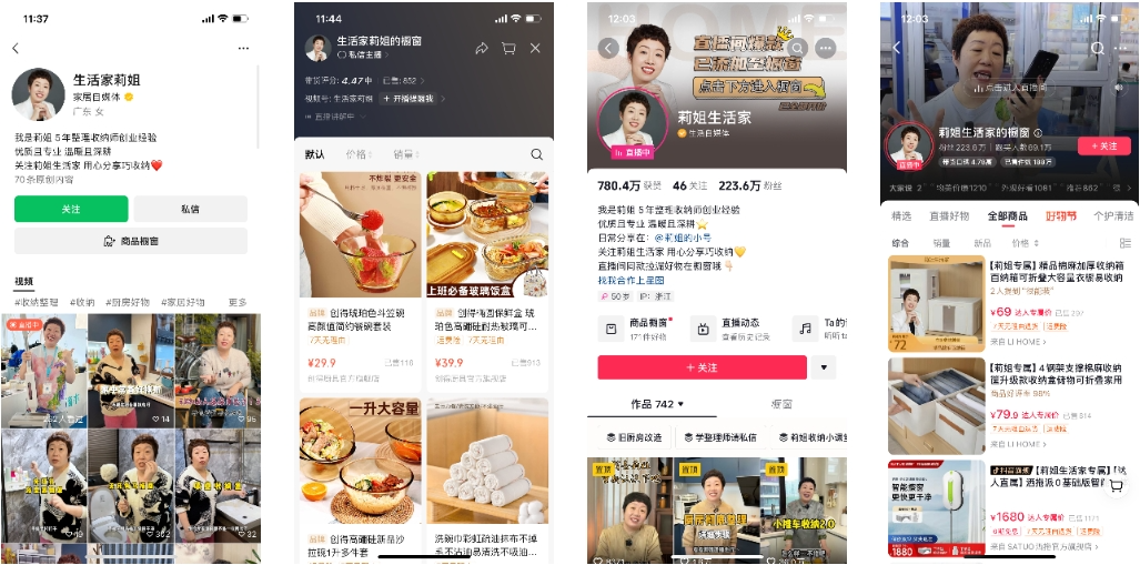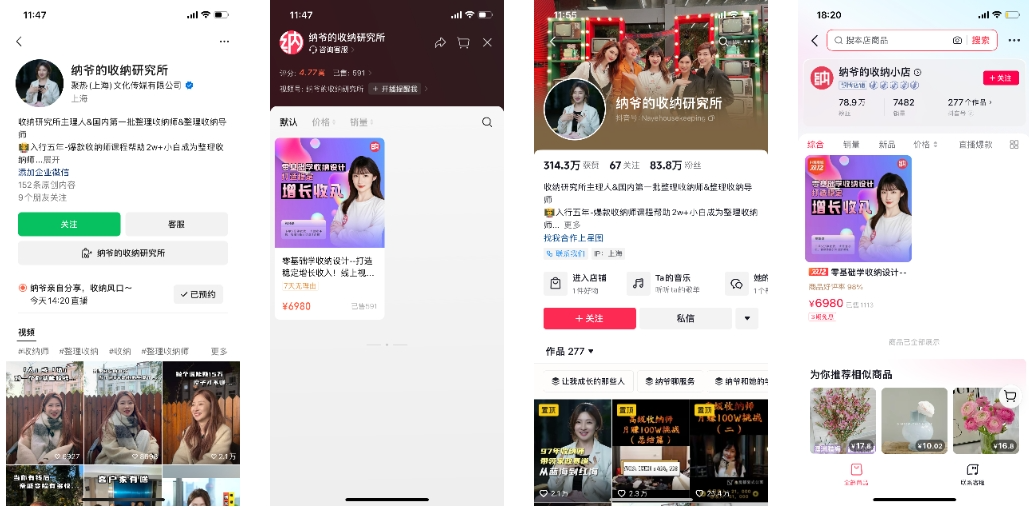 實(shí)際上,最初很多的整理收納師接單,都是通過(guò)抖音等渠道。我們?cè)陔p11專(zhuān)題文章中提到,很多在抖音的中腰部達(dá)人開(kāi)始布局視頻號(hào),整理收納行業(yè)也有一些頭部達(dá)人將視頻號(hào)作為新的渠道布局,但是相比較生活類(lèi)達(dá)人和幽默搞笑類(lèi)達(dá)人,這類(lèi)達(dá)人的遷移,似乎就沒(méi)有那么順利了。以抖音整理收納頭部賬號(hào)【莉姐生活家】為例,雖然在抖音擁有200多萬(wàn)粉絲,小紅書(shū)也有20多萬(wàn)的粉絲,但莉姐在視頻號(hào)的賬號(hào)【生活家莉姐】似乎并不是那么如意。目前也在持續(xù)更新短視頻內(nèi)容,但是數(shù)據(jù)遠(yuǎn)沒(méi)有在抖音的好,視頻號(hào)小店的銷(xiāo)售數(shù)據(jù)甚至還沒(méi)有達(dá)到【整理收納師小米 】和【整理收納師艾莉】的零頭。(莉姐在視頻號(hào)和抖音的賬號(hào)介紹和櫥窗顯示銷(xiāo)量對(duì)比)95后東北姑娘賈妍是中國(guó)較早一批整理收納師之一,她另一個(gè)為人熟知的身份是【納爺?shù)氖占{研究所】的創(chuàng)始人,是在抖音擁有80多萬(wàn)粉絲的整理收納師,同時(shí)也是一個(gè)經(jīng)常出入明星家里的網(wǎng)紅收納師。相對(duì)于莉姐來(lái)說(shuō),賈妍的視頻號(hào)【納爺?shù)氖占{研究所】還算運(yùn)營(yíng)得有聲有色,賈妍從很早開(kāi)始就將抖音的短視頻內(nèi)容搬運(yùn)到視頻號(hào)中,數(shù)據(jù)好的也有10萬(wàn)+點(diǎn)贊推薦數(shù)。賈妍曾在抖音上靠著“收納師挑戰(zhàn)月賺100萬(wàn)”的視頻,一天吸粉15萬(wàn)。從賬號(hào)的直播情況來(lái)看,雖然沒(méi)有動(dòng)輒百萬(wàn),幾十萬(wàn)的場(chǎng)觀,但依靠著創(chuàng)業(yè)經(jīng)歷和收納知識(shí)分享的直播內(nèi)容,也能在視頻號(hào)獲得單場(chǎng)上萬(wàn)的場(chǎng)觀,不過(guò),可以明顯發(fā)現(xiàn),直播的內(nèi)容跟在抖音直播的內(nèi)容是一模一樣的。