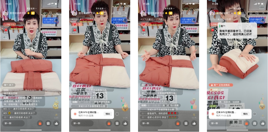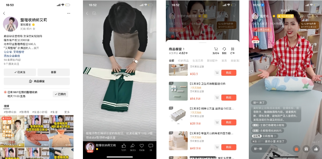 如果要用一個(gè)詞形容【整理收納師小米】直播間的基本調(diào)性,“實(shí)操陪伴”大概是比較合適的,而主播充當(dāng)?shù)木褪恰芭惆檎斫叹殹钡慕巧?/span>圍繞著陪伴整理教練這一角色,主播主要有兩大直播特點(diǎn):一是耐心細(xì)致地引導(dǎo)和教學(xué),這幾乎是這類(lèi)直播間的主播的基本素質(zhì):每一個(gè)的步驟,每一個(gè)細(xì)節(jié)點(diǎn),都不會(huì)錯(cuò)過(guò),這也決定了直播間的節(jié)奏很慢,除了耐心細(xì)致地呈現(xiàn)操作過(guò)程之外, 主播甚至?xí)磸?fù)重復(fù)關(guān)鍵的操作手法,放慢操作的過(guò)程,以求讓直播間的觀眾都能學(xué)會(huì)。在節(jié)奏緩慢之余,主播還非常注重直播間的互動(dòng)氛圍,除了會(huì)一一步一步確認(rèn)大家是否學(xué)會(huì)了之外,主播還會(huì)根據(jù)直播間觀眾的要求來(lái)決定接下來(lái)要講解的收納技巧。隨著整理收納技巧的展示,直播間就會(huì)有不少姐姐們開(kāi)始詢(xún)問(wèn),主播用的收納盒怎么賣(mài);過(guò)程中,主播會(huì)簡(jiǎn)單介紹一下收納盒的價(jià)格和特點(diǎn);除了收納盒之外,直播間一般還會(huì)掛一些小件的生活家居用品。【整理收納師艾莉】也是以這樣的方式進(jìn)行直播的直播間代表,從直播間的內(nèi)容和掛車(chē)產(chǎn)品的類(lèi)目來(lái)看,兩個(gè)直播間并沒(méi)有太大的差異。不過(guò)在話(huà)術(shù)上,艾莉會(huì)更加關(guān)注細(xì)節(jié),比如“白色羽絨服如何實(shí)現(xiàn)用里子保住面子?“,避免弄臟羽絨服,除了實(shí)操技巧之外,也關(guān)注到了用戶(hù)在日常收納中的小痛點(diǎn)。在直播間外,我們發(fā)現(xiàn),艾莉有自己的工廠。在短視頻中,艾莉介紹了自己創(chuàng)立“艾莉整理 "品牌以及自有工廠的情況。事實(shí)上,作為一個(gè)高級(jí)職業(yè)整理師和資深空間規(guī)劃師,艾莉培養(yǎng)了職業(yè)整理師超過(guò)500人,團(tuán)隊(duì)已經(jīng)服務(wù)客戶(hù)超過(guò)2000家。直播間的產(chǎn)品前面也有明顯的【艾莉家】的品牌標(biāo)識(shí)。值得注意的是,從直播間的主播來(lái)看,一般一場(chǎng)幾個(gè)小時(shí)的直播,至少會(huì)有兩個(gè)主播輪流直播,這大概也是因?yàn)檫@種類(lèi)型的直播要長(zhǎng)時(shí)間彎腰和動(dòng)手,還是挺消耗體力的,一個(gè)主播很難播整場(chǎng)。實(shí)際上,收納師是一門(mén)需要專(zhuān)業(yè)度、審美力,并需要付出極大體力腦力活動(dòng)的工作。