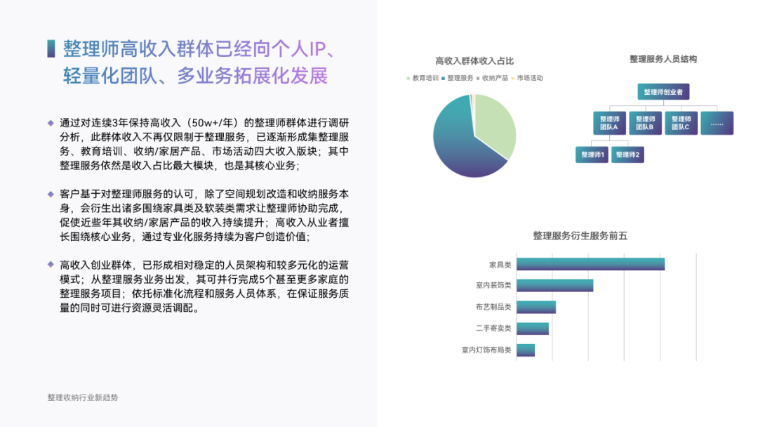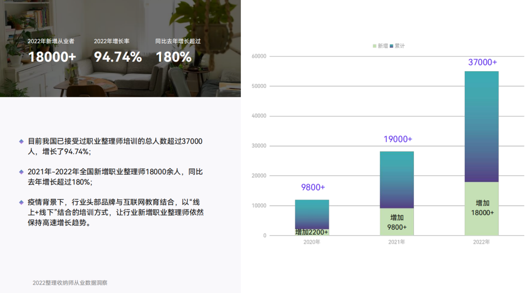 如果將鏡頭拉遠(yuǎn)來(lái)看,我們可以看到整理收納直播間爆火背后的大環(huán)境其實(shí)是整理收納師這一職業(yè)在國(guó)內(nèi)的快速興起。這兩年,隨著國(guó)內(nèi)消費(fèi)能力的提升和消費(fèi)觀念的改變,對(duì)于整理收納的服務(wù)需求也出現(xiàn)了小幅度的爆發(fā)。2021年初,整理收納師也被正式被列入家政服務(wù);央視新聞在解讀“十四五”藍(lán)圖時(shí),特別點(diǎn)名“整理收納師”這一職業(yè),成為國(guó)家發(fā)展現(xiàn)代服務(wù)業(yè)代表的創(chuàng)新風(fēng)口職業(yè)。根據(jù)吳曉波頻道發(fā)布的報(bào)告《2022年新中產(chǎn)大調(diào)研》,在整理服務(wù)的客戶(hù)中,新中產(chǎn)家庭對(duì)整理收納服務(wù)的消費(fèi)頻率達(dá)2—6次/年,復(fù)購(gòu)率達(dá)51%,相比2021年增長(zhǎng)了27.5%。這還是保守計(jì)算的數(shù)據(jù),因?yàn)檫@一年來(lái),各地疫情封控導(dǎo)致許多訂單無(wú)法順利展開(kāi)。處于風(fēng)口上的整理收納師也成為媒體口中的職業(yè)“香餑餑”,每每與“時(shí)薪上千元”、“單次服務(wù)收費(fèi)上萬(wàn)”、“年薪百萬(wàn)”這些關(guān)鍵詞一起出現(xiàn),普通人逆襲的故事也吸引著越來(lái)越多的人投身整理收納行業(yè)。《2022年中國(guó)整理行業(yè)白皮書(shū)》顯示,2022年,全國(guó)新增的整理收納從業(yè)者超過(guò)18000人,同比增長(zhǎng)180%。